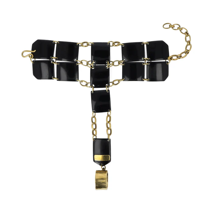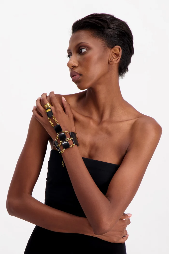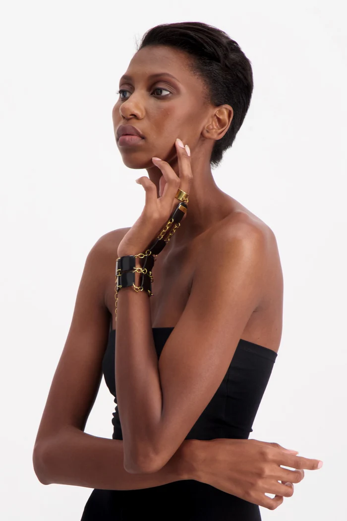 Dieses markante Armband von Margaux Wong verbindet modernes Design mit traditioneller Handwerkskunst. Gefertigt aus tiefschwarzem, poliertem Kuhhorn und goldfarbenen Messingelementen, entsteht ein ausdrucksstarkes Schmuckstück mit architektonischer Struktur und außergewöhnlicher Eleganz.