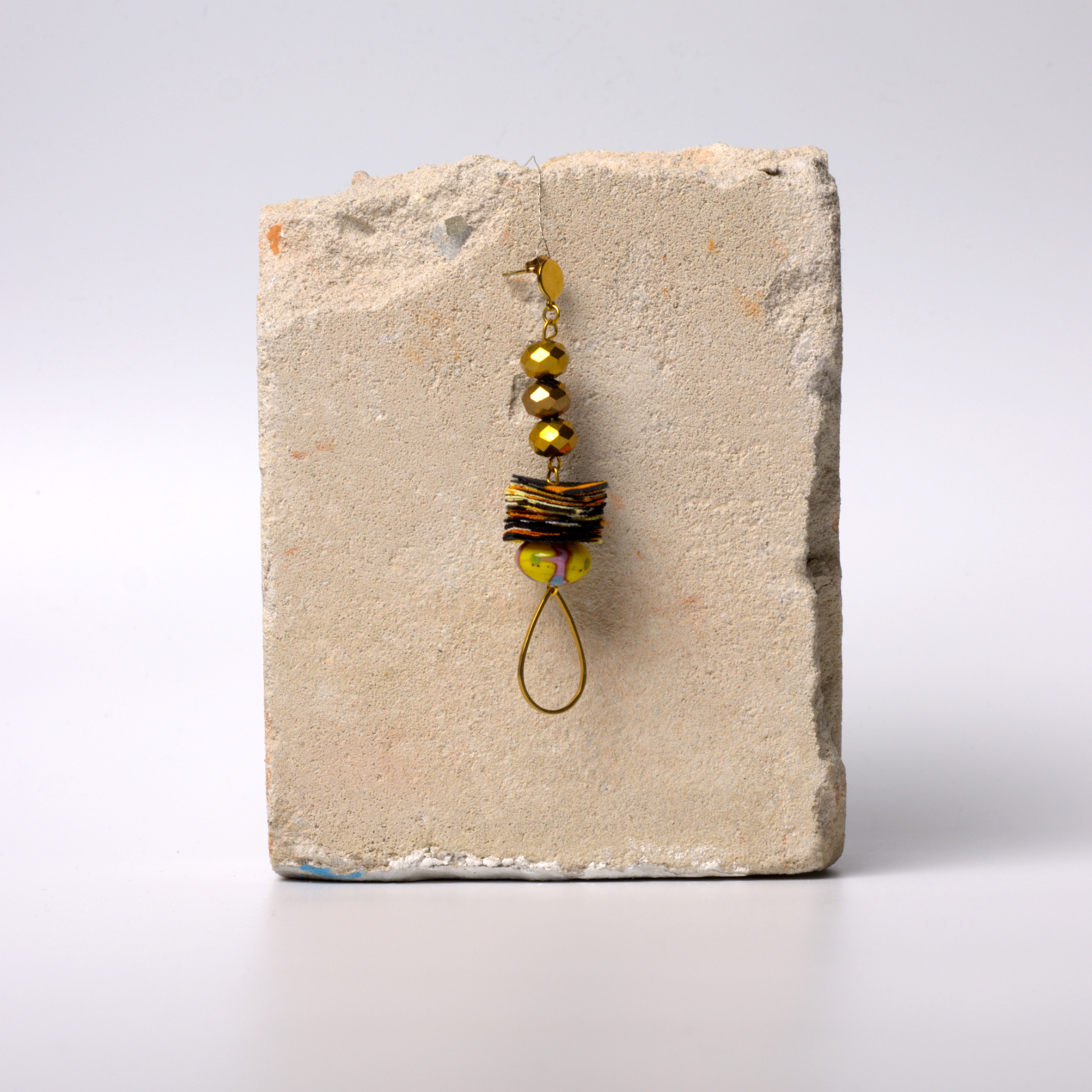 Juplenor Four ist mit drei schillernden goldfarbenen, diamantähnlichen Steinen besetzt, die strategisch platziert sind, um das Licht einzufangen und dem Design einen Hauch von Glamour zu verleihen. Der Ohrring ist mit lebhaften afrikanischen Stoffresten verziert, die den Reichtum des afrikanischen Designs und Erbes zelebrieren.