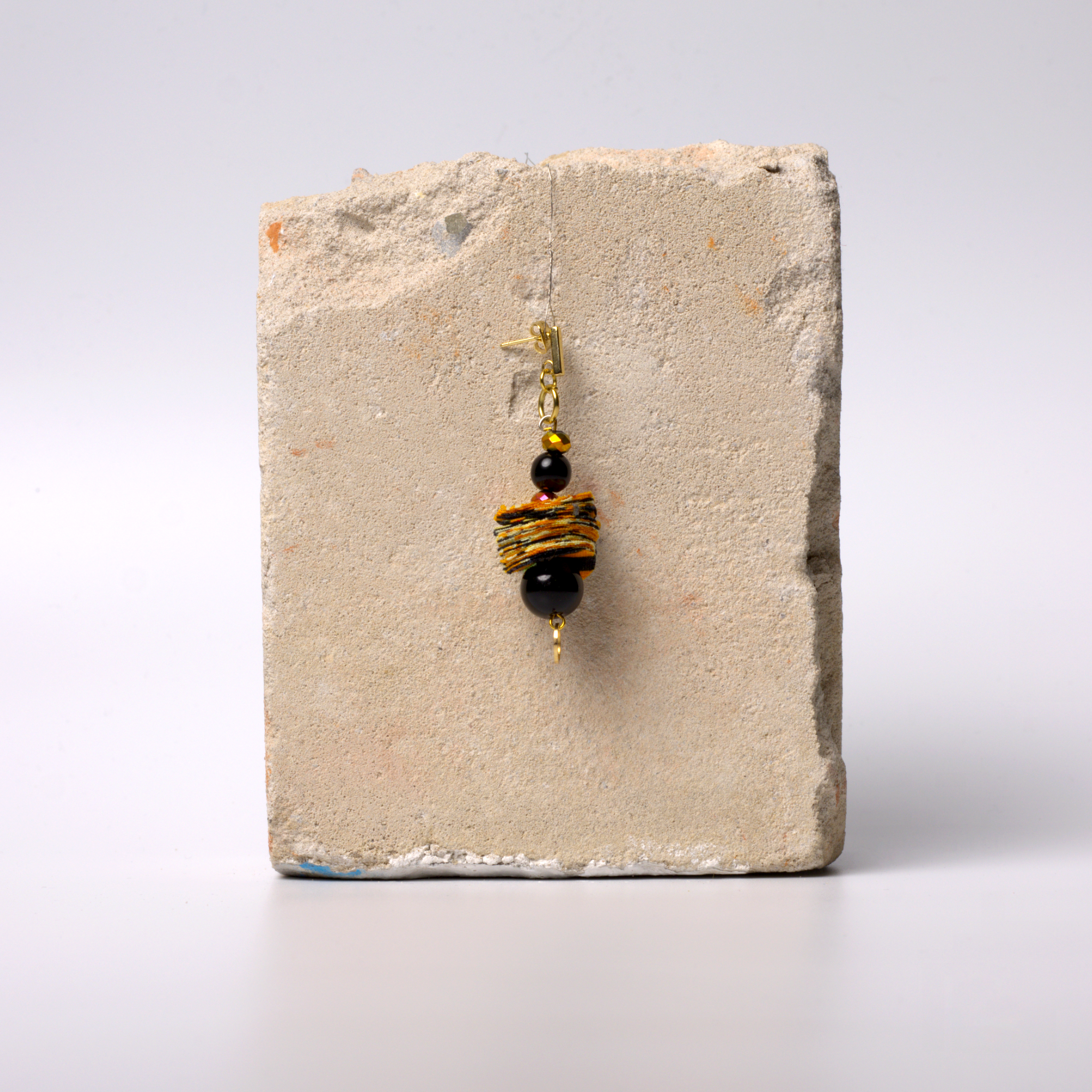 Juplenor Thirteen präsentiert stolz lebendige afrikanische Stoffreste in Gelb-, Orange- und Schwarztönen und schafft so einen harmonischen Farbteppich, der eine Hommage an das vielfältige und lebendige afrikanische Erbe darstellt. Inmitten dieser lebendigen Darstellung stehen zwei wunderschöne schwarze Perlen im Mittelpunkt, die jeweils von zwei diamantähnlichen Steinen umrahmt werden, die dem Design einen Hauch von Glamour und Funkeln verleihen.