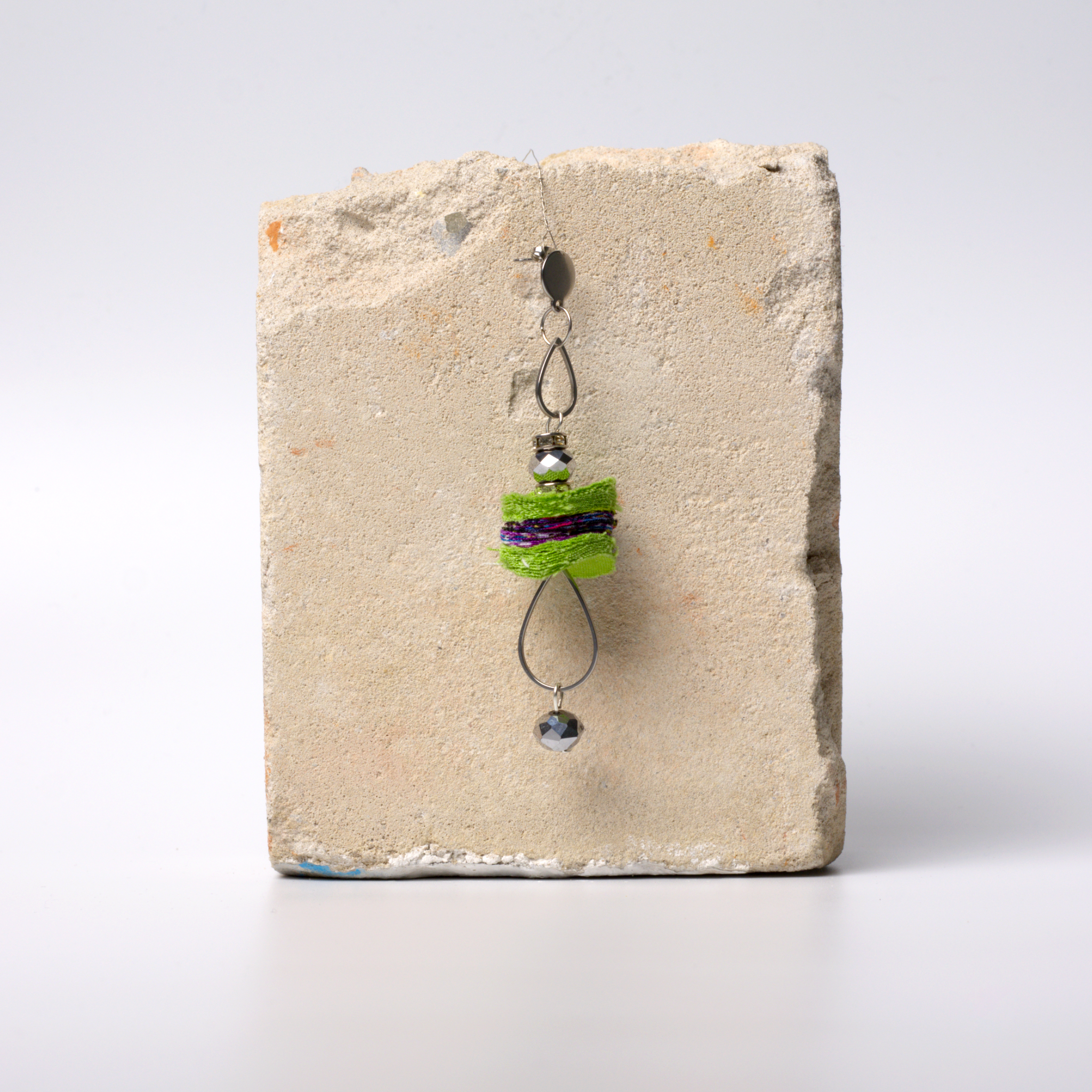 Das Herzstück, der Juplenor Three, besteht aus zwei wunderschönen silbernen, diamantähnlichen Steinen, die dem Design einen Hauch von Glamour und zeitlosem Reiz verleihen. Der Ohrring ist außerdem mit leuchtend grünen und violetten afrikanischen Stoffresten verziert, die ein Kaleidoskop von Farben ergeben, das eine Hommage an das reiche Erbe des afrikanischen Designs ist.
