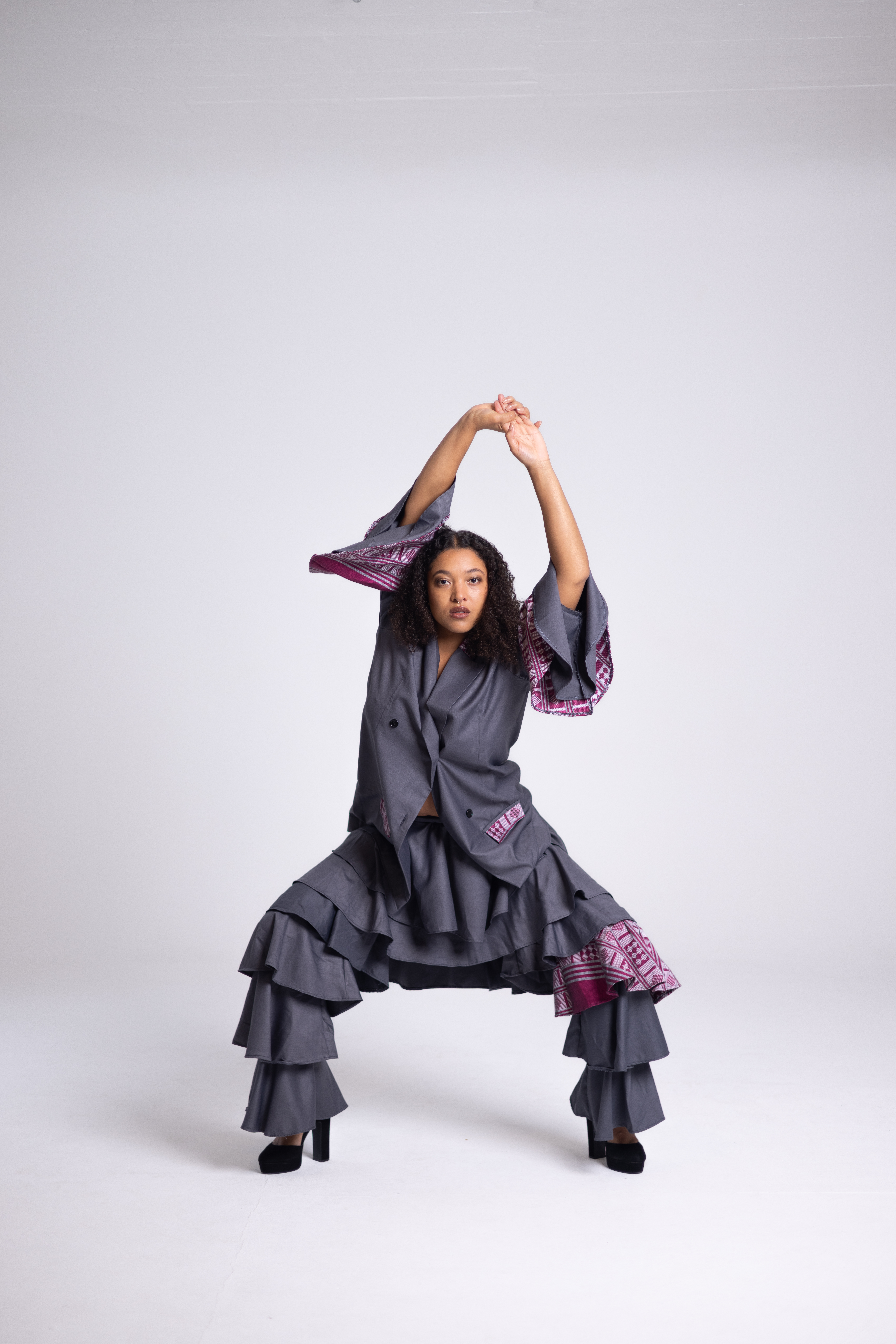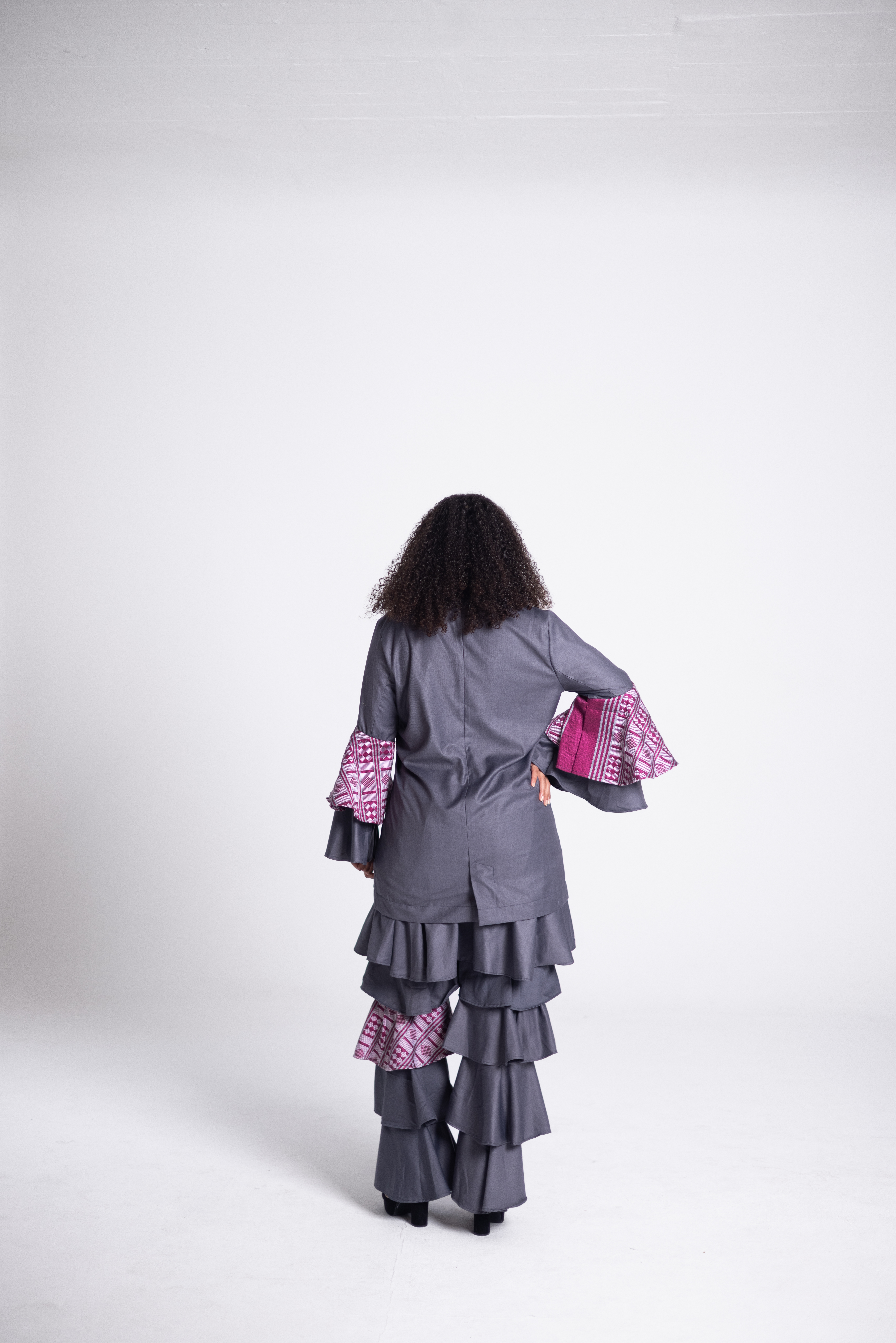 Dieses Outfit ist ein auffälliges und modernes Ensemble mit einem gewagten Design. Es besteht aus einem passenden Oberteil und einer Hose aus grauem Metallic-Stoff. Das Oberteil zeichnet sich durch dramatische Lagenärmel mit Rüschendetails und Akzenten aus leuchtend rosa gemustertem Stoff auf der Innenseite aus, die für einen Farbakzent und kulturelles Flair sorgen. Die Hose greift das mehrlagige Rüschendesign auf und sorgt so für einen kohärenten Look. Die Gesamtästhetik verbindet Eleganz mit künstlerischer Kreativität, ideal, um ein Statement zu setzen.