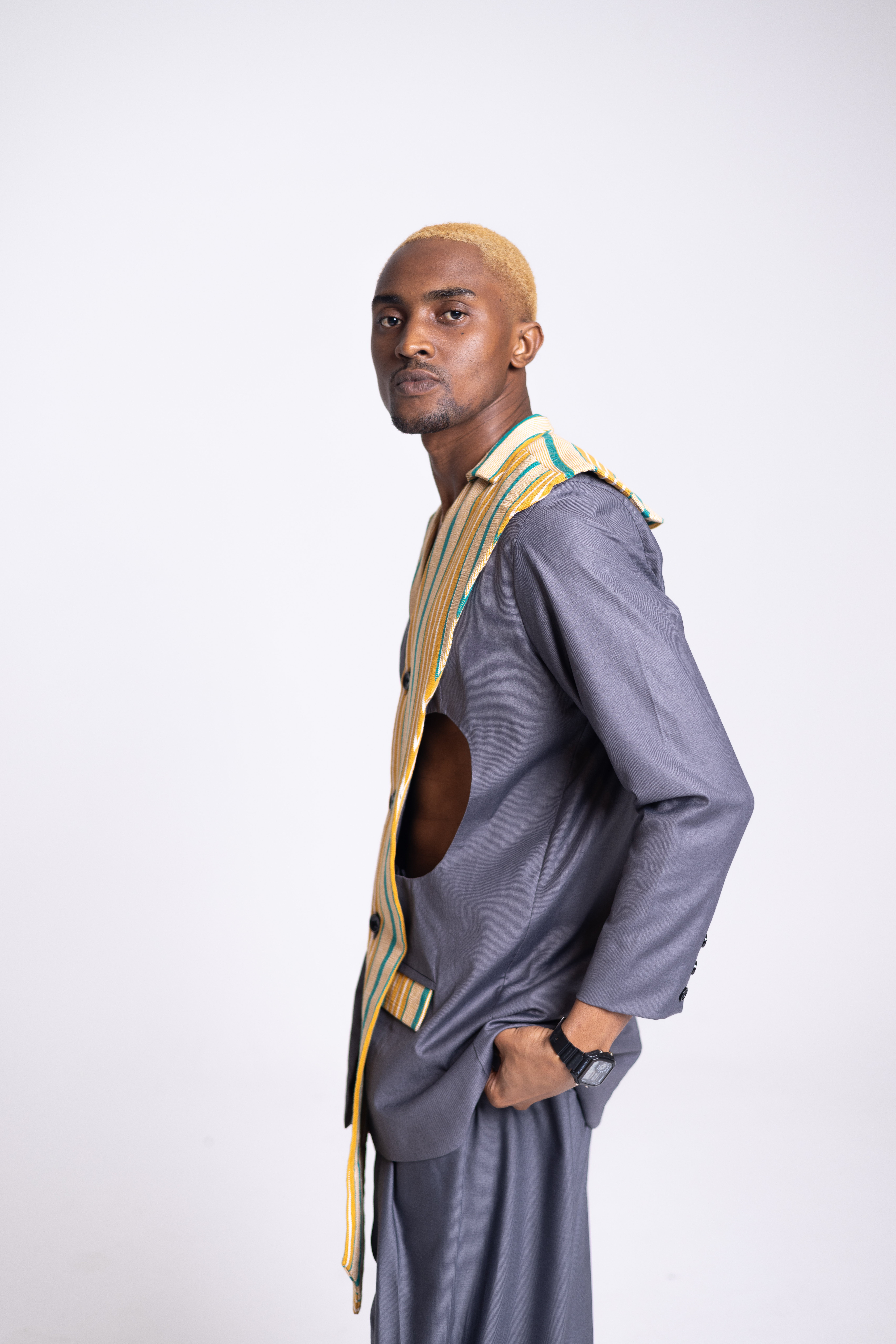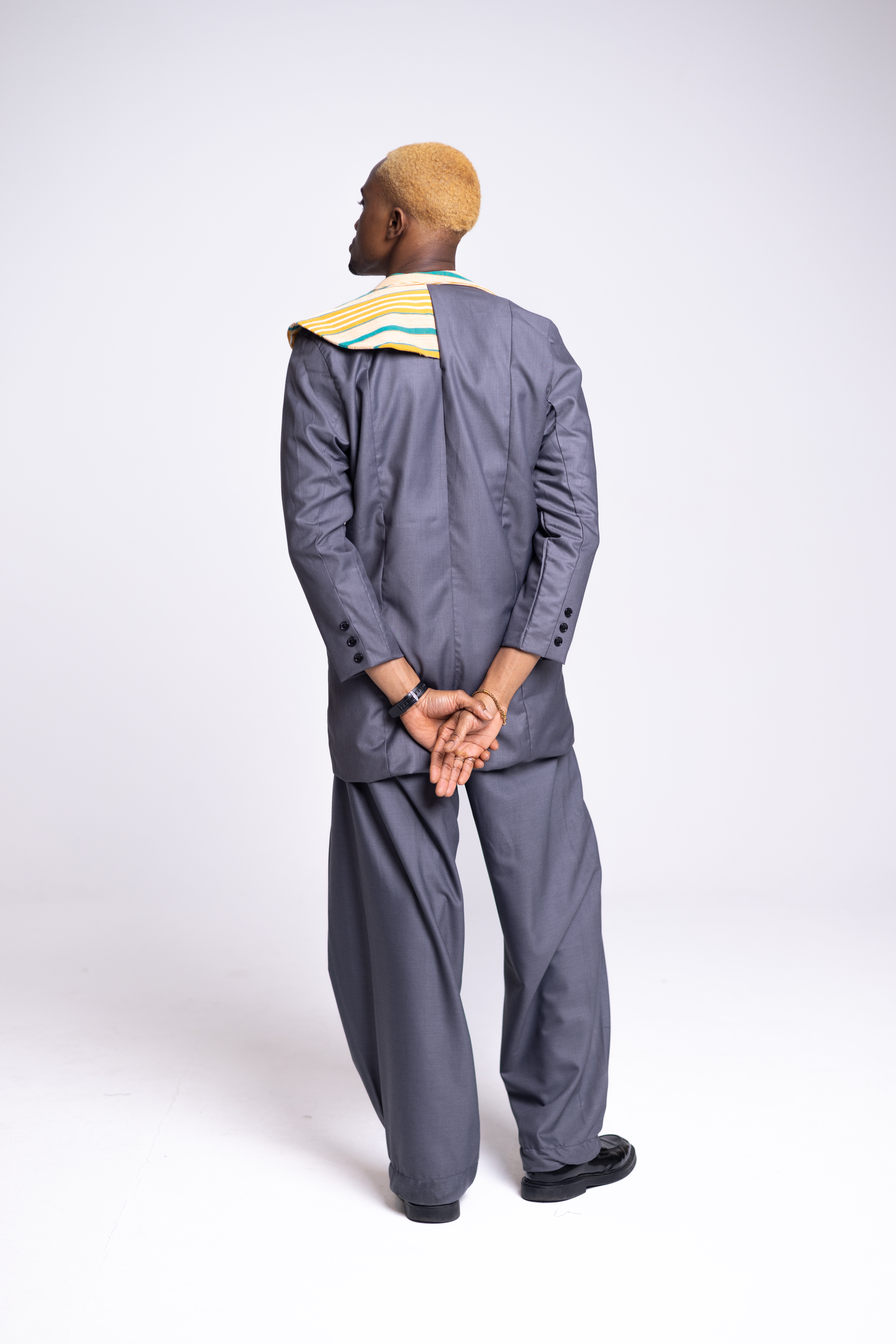 Dieses Outfit ist eine moderne und stilvolle Interpretation der traditionellen Herrenmode. Es besteht aus einem entspannten, langärmeligen grauen Hemd mit einem auffälligen Detail: einem gelb und grün gestreiften Stoff, der dem Design Lebendigkeit und Asymmetrie verleiht. Das Hemd wird mit einer locker sitzenden, drapierten grauen Hose kombiniert, die die moderne und bequeme Ästhetik noch verstärkt. Der Gesamtlook verbindet Eleganz mit Kühnheit und ist perfekt, um ein anspruchsvolles Modestatement zu setzen.