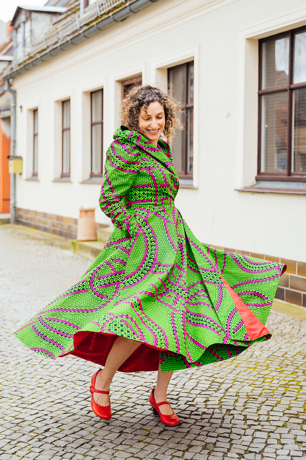 Das auffällige pink-grünfarbene Design des Kleides ist ein Statement für Individualität und Modebewusstsein. Die Kombination aus lebendigen Farben und einem femininen Schnitt verleiht diesem Kleid eine einzigartige Ausstrahlung, die perfekt für jede moderne Frau ist.