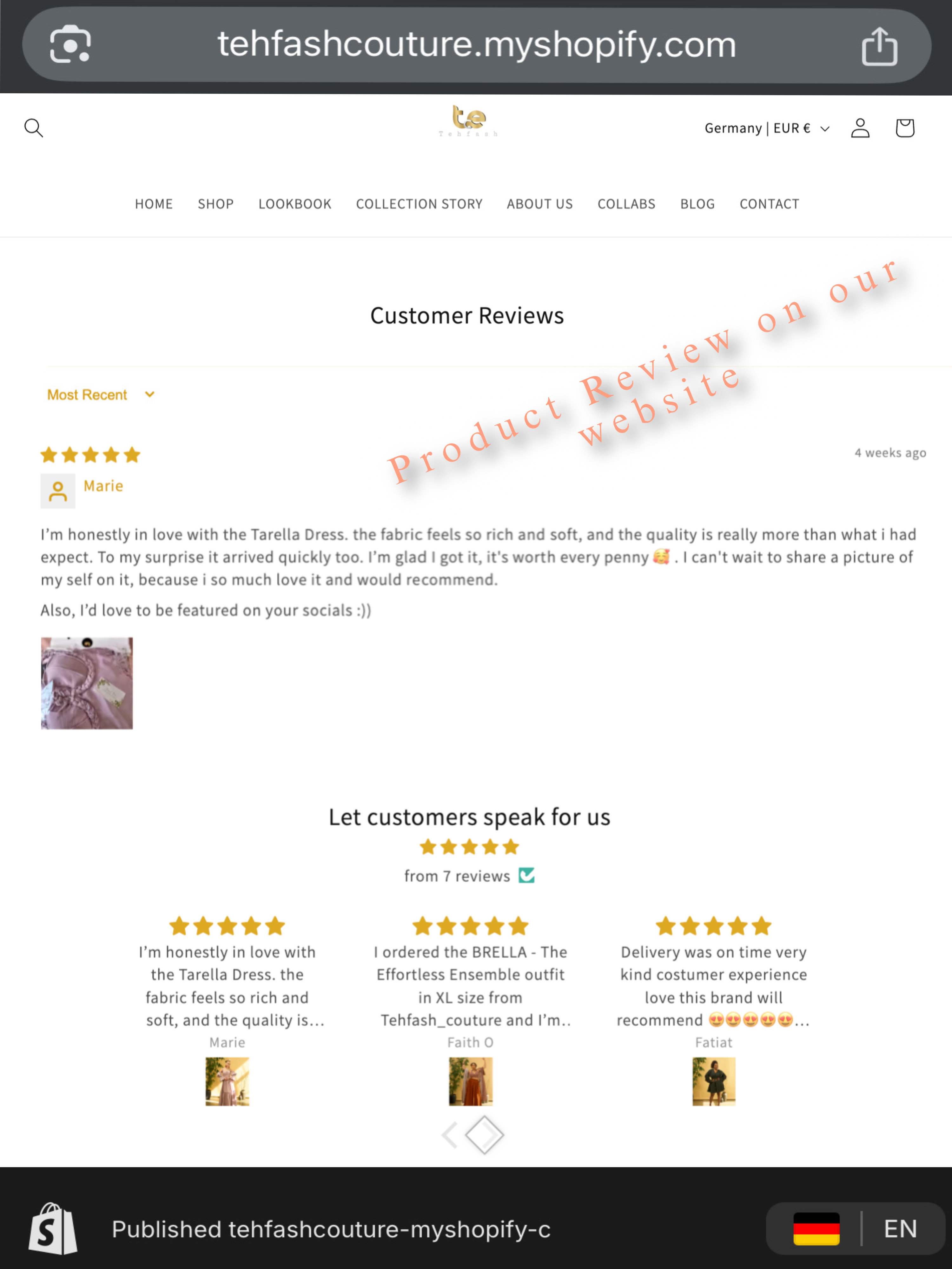 Jedes Kleid wird liebevoll von Tehfash gefertigt, mit hochwertigen EU-Stoffen und nachhaltiger Produktion.