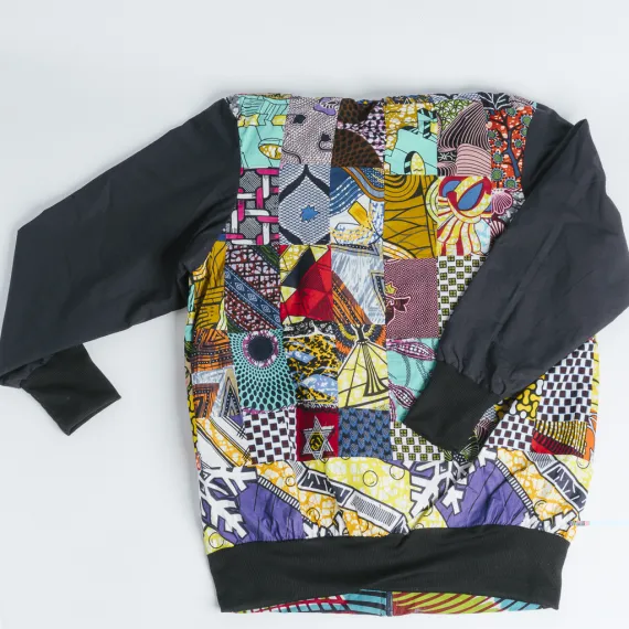 Eine handgefertigte Patchwork-Jacke, hergestellt aus Stoffresten im Blouson-Stil, die beidseitig tragbar ist. Die Jacke ist leicht gefüttert und verfügt über ein elastisches Bändchen an der Taille für eine bequeme Passform. Mit einem Reißverschluss vorne und zwei Seitentaschen ausgestattet. Hergestellt aus 90% Baumwolle und 10% Elastan, ist die Jacke pflegeleicht und kann bei 30 Grad in der Maschine gewaschen werden. Der Begriff "Mazin" bedeutet "Ich strahle" in der togoischen Sprache, und diese Jacke folgt dem aktuellen Trend, um einen coolen Look zu verleihen. Jede Patchwork-Jacke ist ein Unikat, daher werden die Muster und Farben des Patchworks zwar nicht genau wie abgebildet sein, jedoch bleibt der Schnitt und die Hauptfarben unverändert.